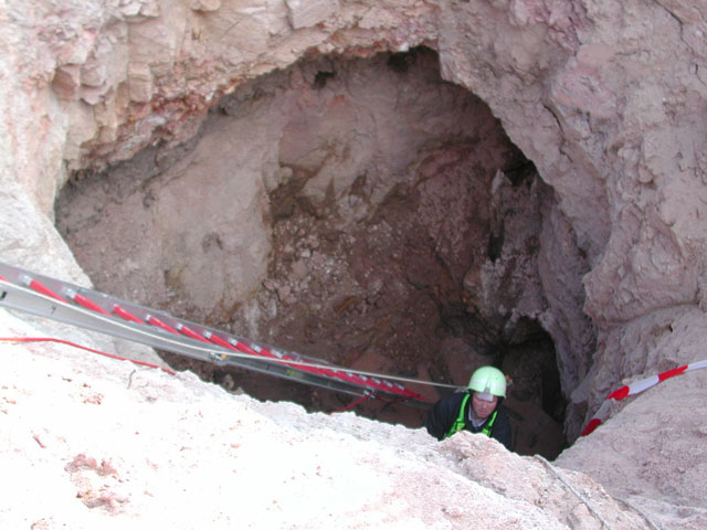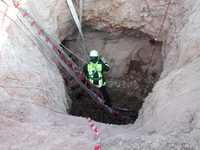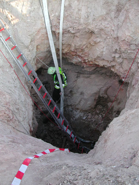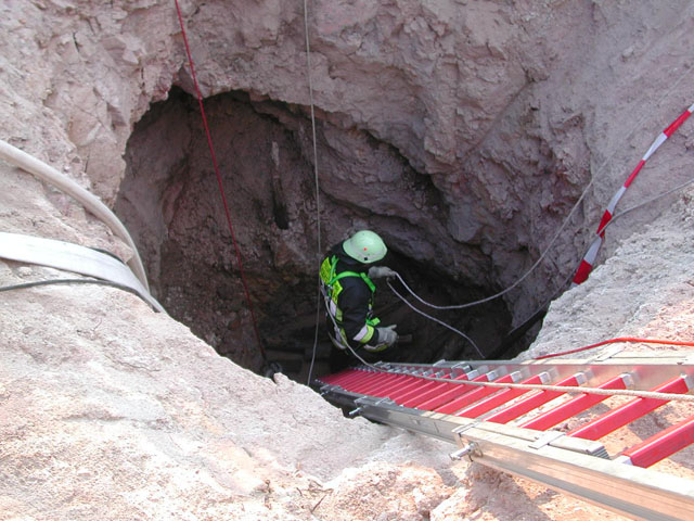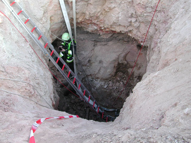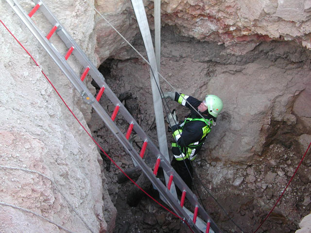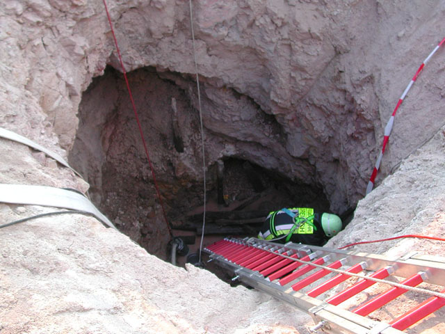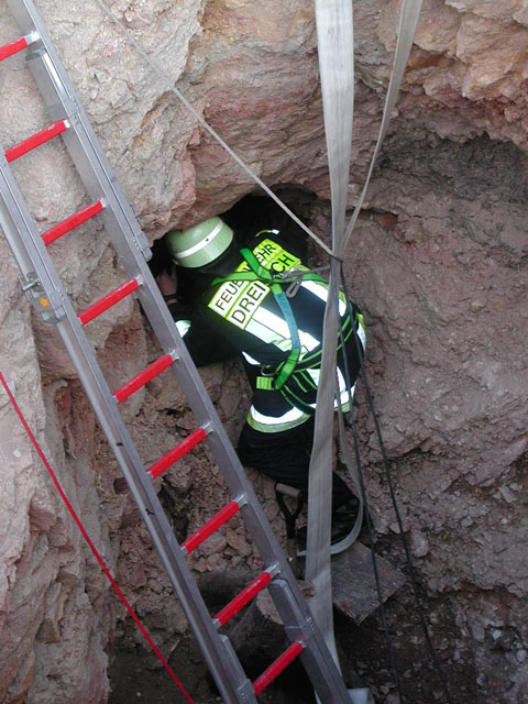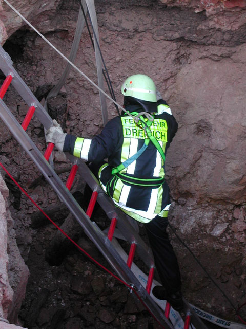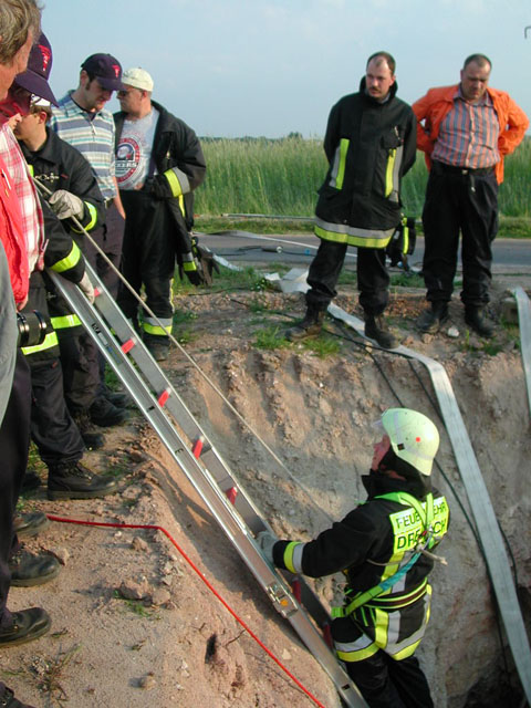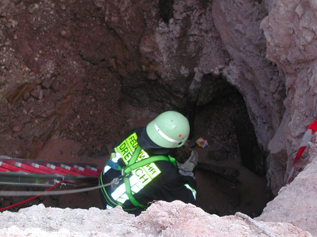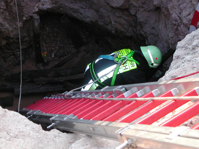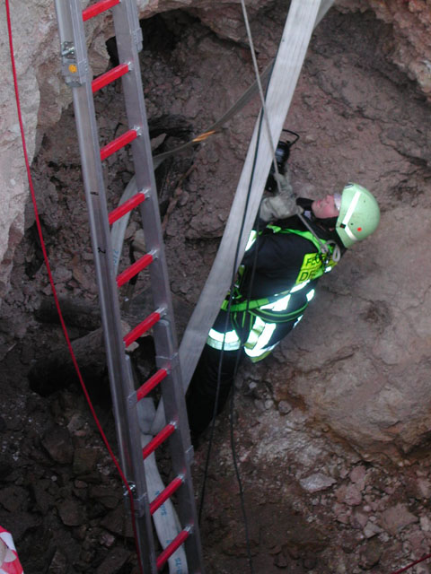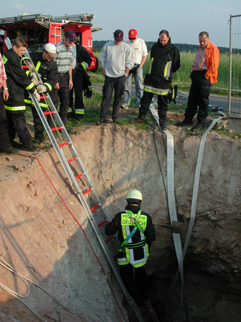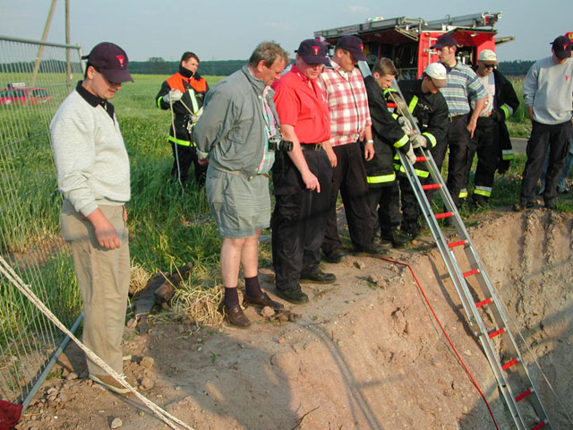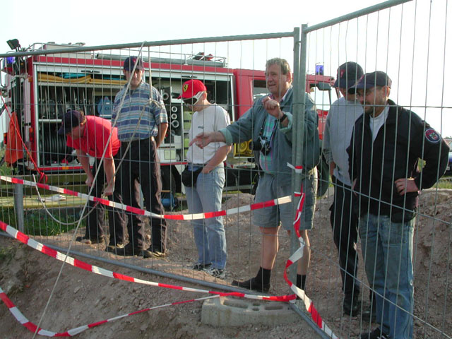 Dreieich-Götzenhain, 31. Mai 2001 Auch die Feuerwehr Götzenhain unterstützt Helmut Keim bei seinen Vorhaben um den Schwerspat-Stollen im Höchsten. Am vergangenen Donnerstag Abend, dem 31. Mai 2001, rückten etwa zehn Einsatzkräfte im Höchsten an, um Wasser aus dem Zugang zum Stollen zu pumpen. Weiterhin wurde die etwa 6,50 m tiefe Grube im Boden vorsichtig unter Zuhilfenahme von Sicherheitsvorkehrungen erkundet. Nach dem Auspumpen wurden insgesamt drei Zugänge zu Stollen in einer Tiefe von etwa 5 Metern lokalisiert. Zwei der Stollen führen in Richtung des Bolzplatzes, ein anderer Stollen in Richtung der alten Eiche im Wiesengrund. Die Stollen besitzen eine Länge von etwa 30 - 120 m. Klaus Klepper, Wehrführer der Götzenhainer Wehr, geht daher von einer nicht bekannten Einsturzgefahr aus. Er rät Neugierigen dringend davon ab, die Stollen zu betreten. Gegen 22.00 Uhr war die Aktion für die Feuerwehr Götzenhain beendet. Bilder: